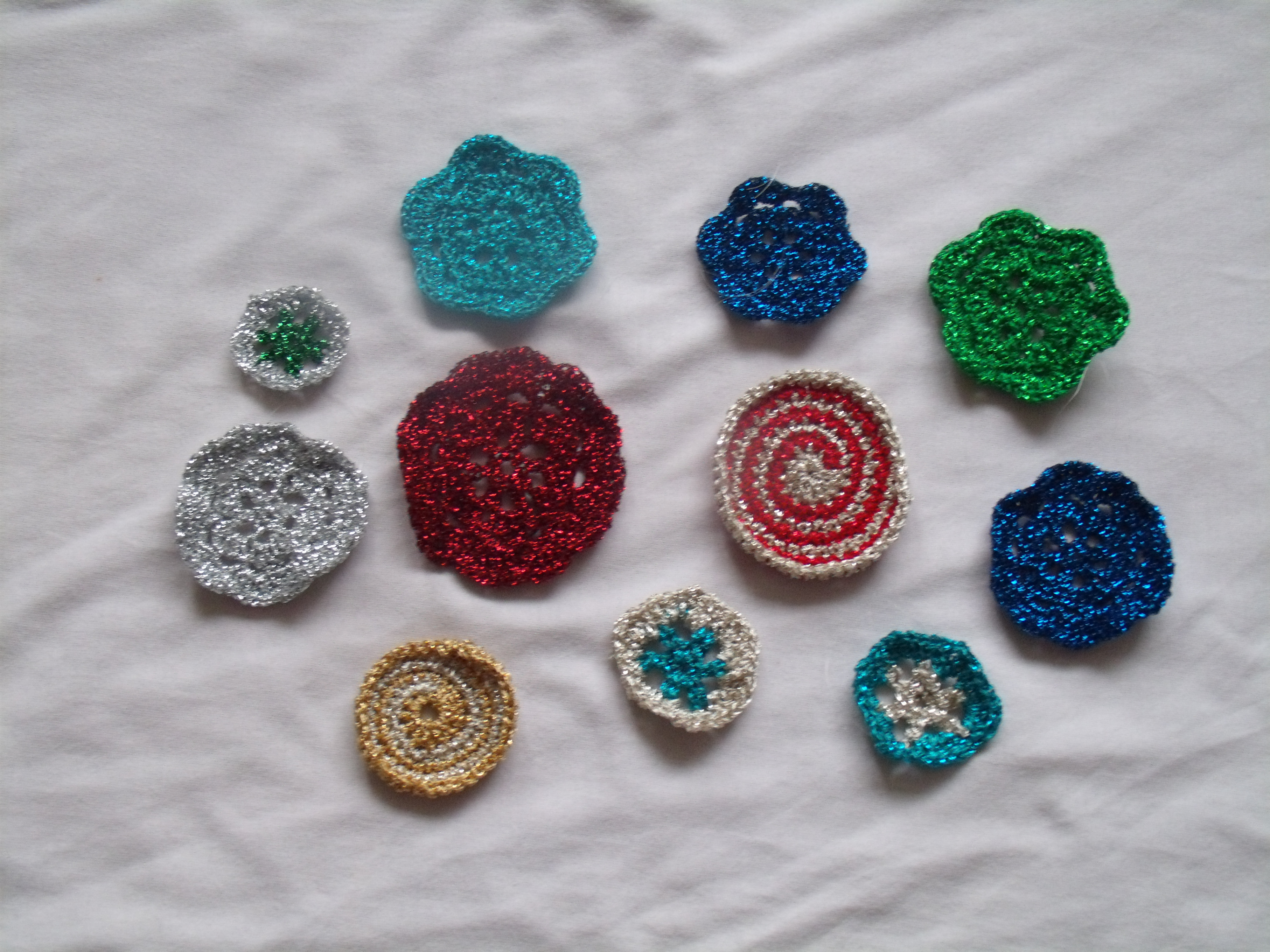 These are Christmas decorations I made last year.  Some looked quite good on trees, or other plants, others have been used for mats under candles.  They really can catch the light.  I used some ends of reels to make some, and 2 colours in others.  They certainly make different gifts.  I enjoyed doing the double spiral ones.